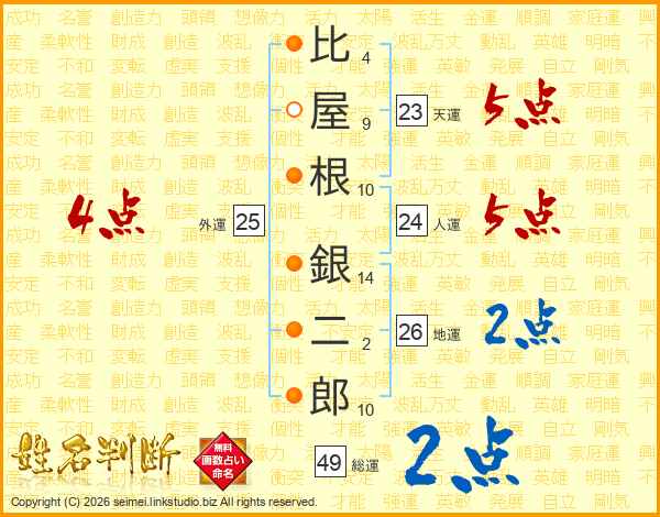 比(4画)屋(9画)根(10画) 銀(14画)二(2画)郎(10画)