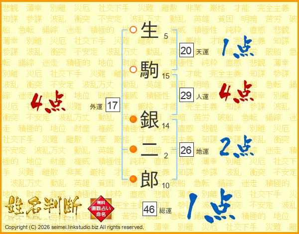 生(5画)駒(15画) 銀(14画)二(2画)郎(10画)
