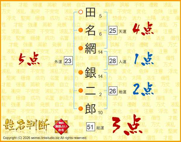 田(5画)名(6画)網(14画) 銀(14画)二(2画)郎(10画)