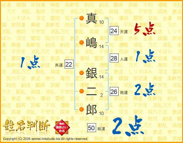 真(10画)嶋(14画) 銀(14画)二(2画)郎(10画)