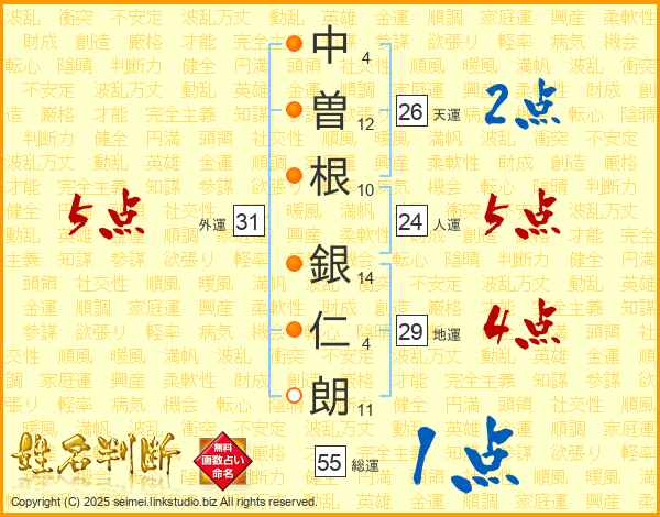中(4画)曽(12画)根(10画) 銀(14画)仁(4画)朗(11画)