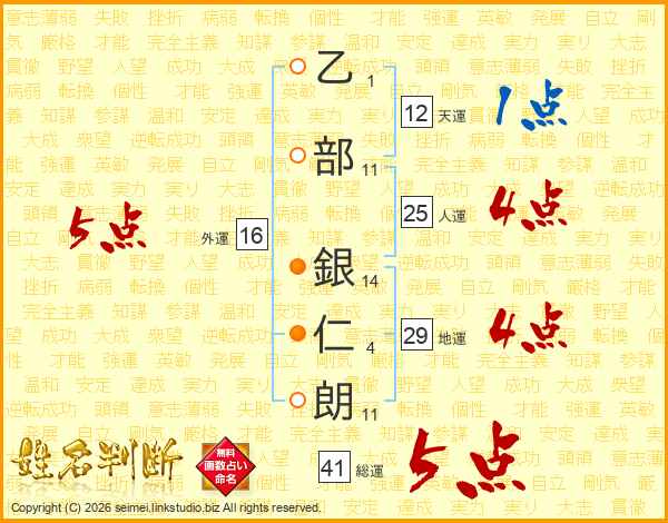 乙(1画)部(11画) 銀(14画)仁(4画)朗(11画)