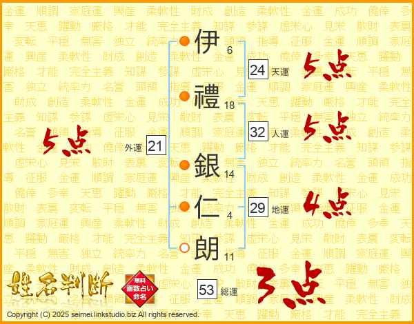 伊(6画)禮(18画) 銀(14画)仁(4画)朗(11画)