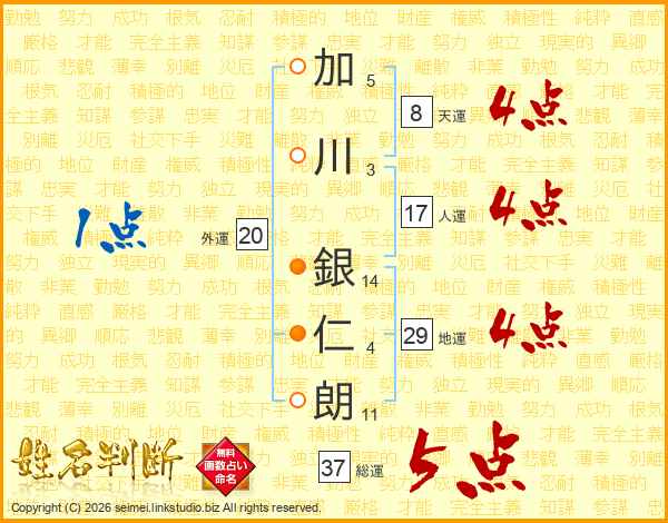 加(5画)川(3画) 銀(14画)仁(4画)朗(11画)