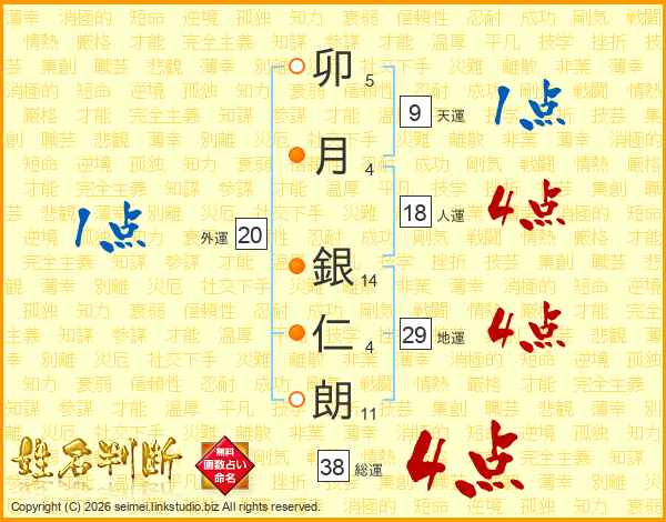 卯(5画)月(4画) 銀(14画)仁(4画)朗(11画)