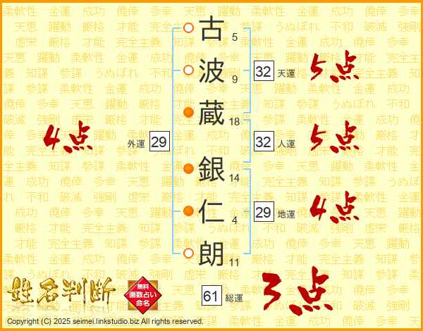 古(5画)波(9画)蔵(18画) 銀(14画)仁(4画)朗(11画)