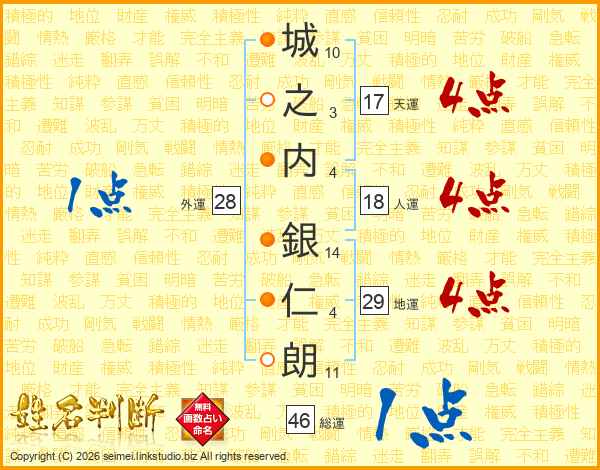 城(10画)之(3画)内(4画) 銀(14画)仁(4画)朗(11画)