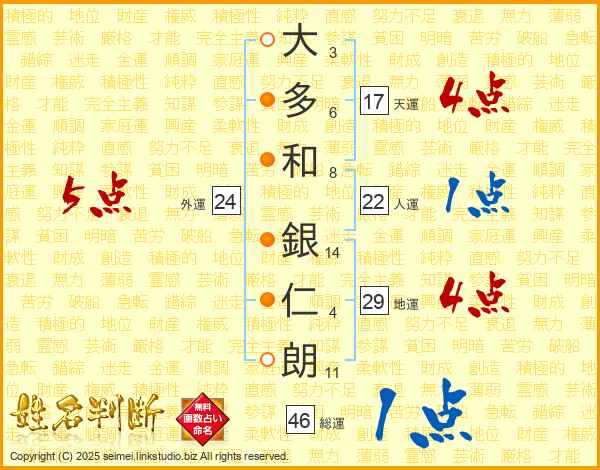 大(3画)多(6画)和(8画) 銀(14画)仁(4画)朗(11画)