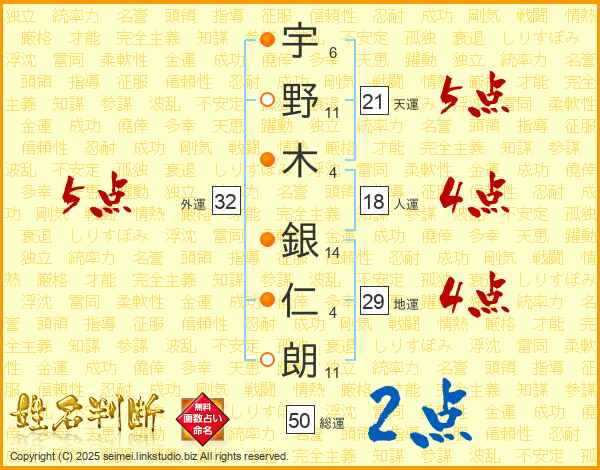 宇(6画)野(11画)木(4画) 銀(14画)仁(4画)朗(11画)