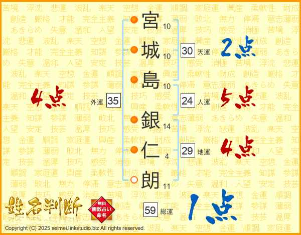 宮(10画)城(10画)島(10画) 銀(14画)仁(4画)朗(11画)
