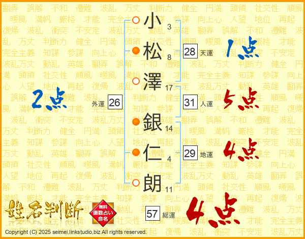 小(3画)松(8画)澤(17画) 銀(14画)仁(4画)朗(11画)