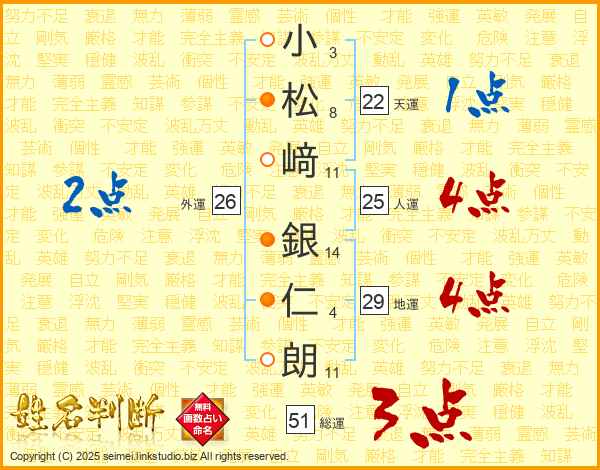 小(3画)松(8画)﨑(11画) 銀(14画)仁(4画)朗(11画)