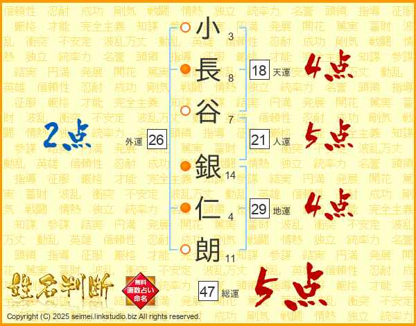 小(3画)長(8画)谷(7画) 銀(14画)仁(4画)朗(11画)