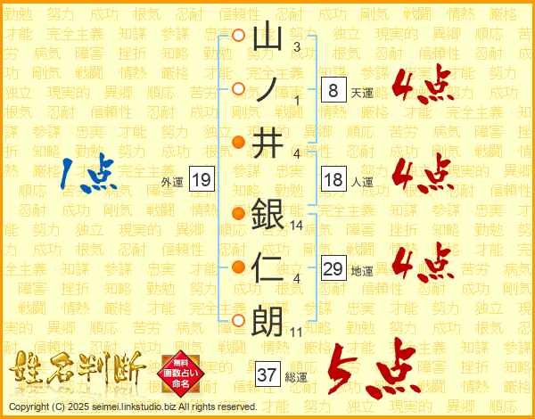 山(3画)ノ(1画)井(4画) 銀(14画)仁(4画)朗(11画)