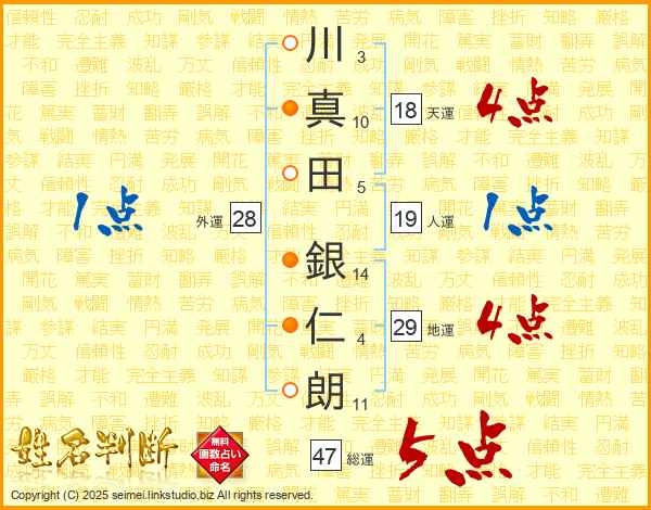 川(3画)真(10画)田(5画) 銀(14画)仁(4画)朗(11画)