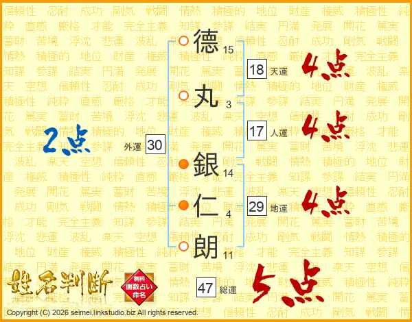 德(15画)丸(3画) 銀(14画)仁(4画)朗(11画)