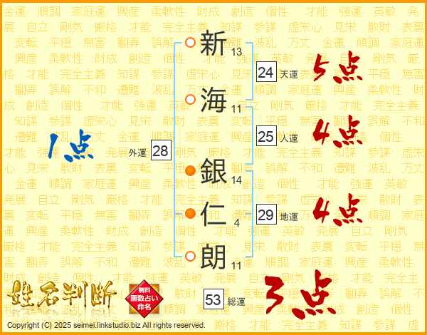 新(13画)海(11画) 銀(14画)仁(4画)朗(11画)