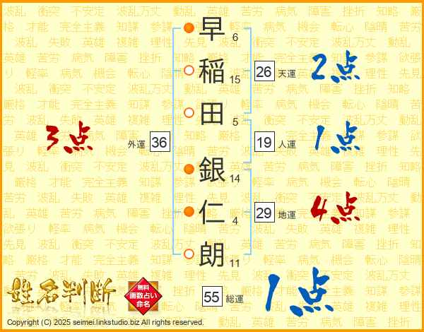 早(6画)稲(15画)田(5画) 銀(14画)仁(4画)朗(11画)