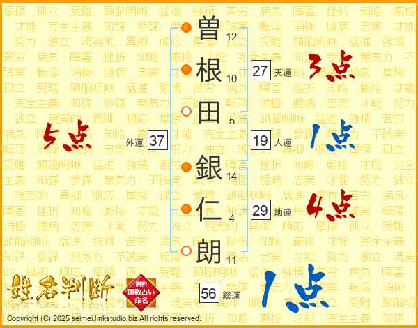 曽(12画)根(10画)田(5画) 銀(14画)仁(4画)朗(11画)