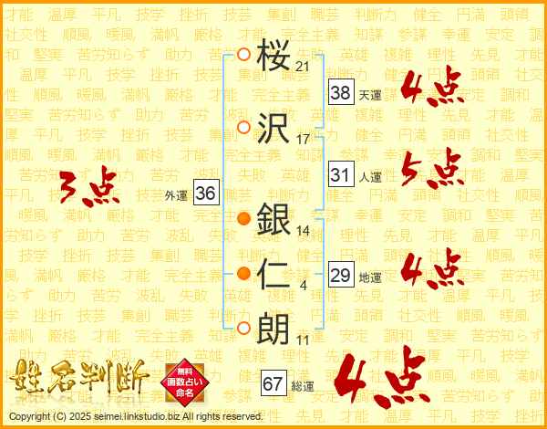 桜(21画)沢(17画) 銀(14画)仁(4画)朗(11画)