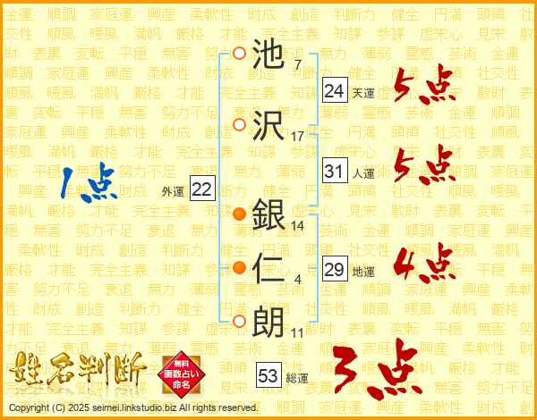 池(7画)沢(17画) 銀(14画)仁(4画)朗(11画)