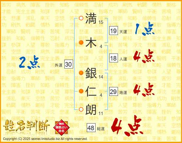 満(15画)木(4画) 銀(14画)仁(4画)朗(11画)