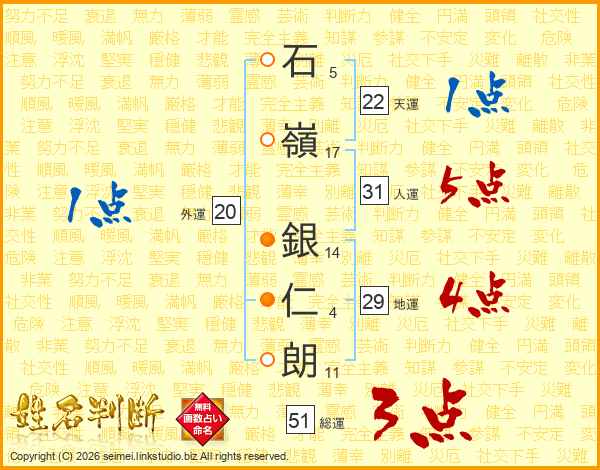 石(5画)嶺(17画) 銀(14画)仁(4画)朗(11画)