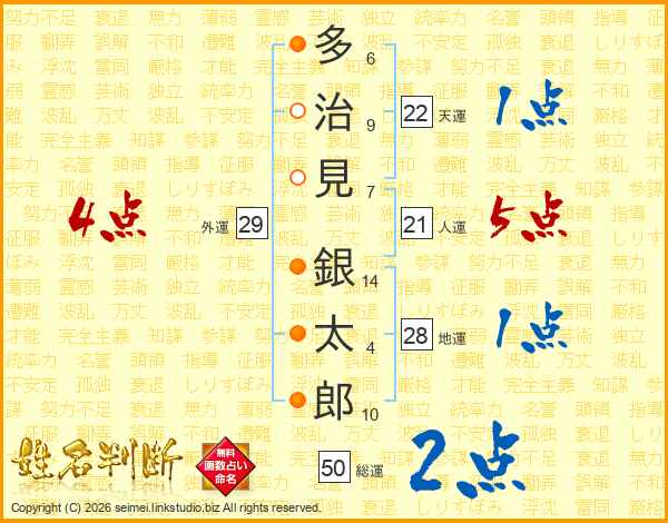 多(6画)治(9画)見(7画) 銀(14画)太(4画)郎(10画)