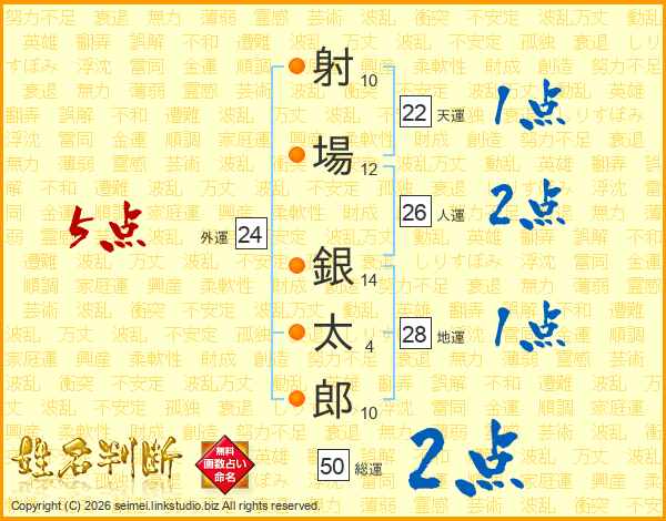 射(10画)場(12画) 銀(14画)太(4画)郎(10画)