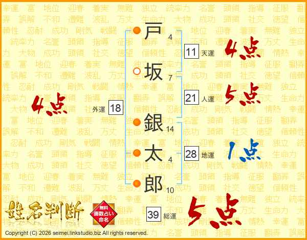 戸(4画)坂(7画) 銀(14画)太(4画)郎(10画)