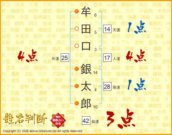 牟(6画)田(5画)口(3画) 銀(14画)太(4画)郎(10画)