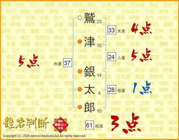 鷲(23画)津(10画) 銀(14画)太(4画)郎(10画)