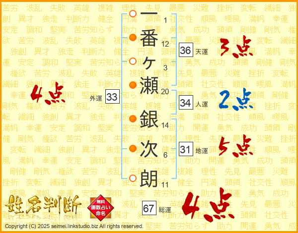 一番ヶ瀬銀次朗さんの総運は67画の4点!
