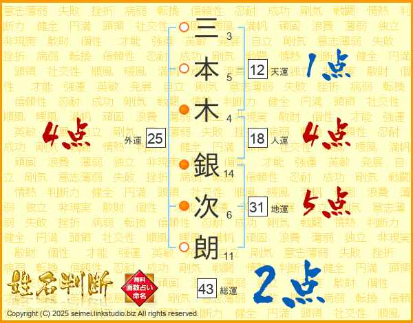 三(3画)本(5画)木(4画) 銀(14画)次(6画)朗(11画)