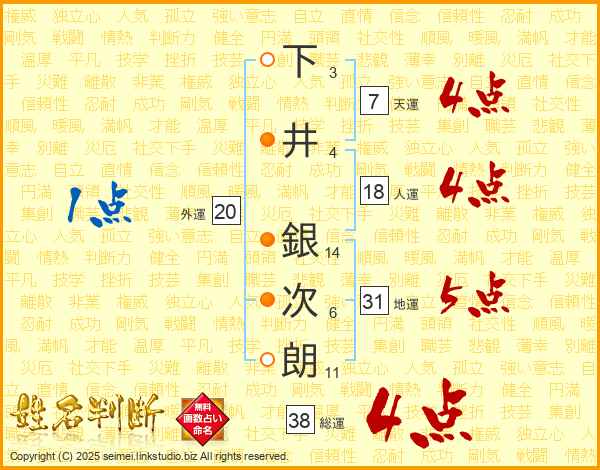 下(3画)井(4画) 銀(14画)次(6画)朗(11画)