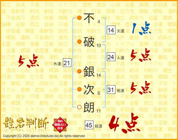 不(4画)破(10画) 銀(14画)次(6画)朗(11画)
