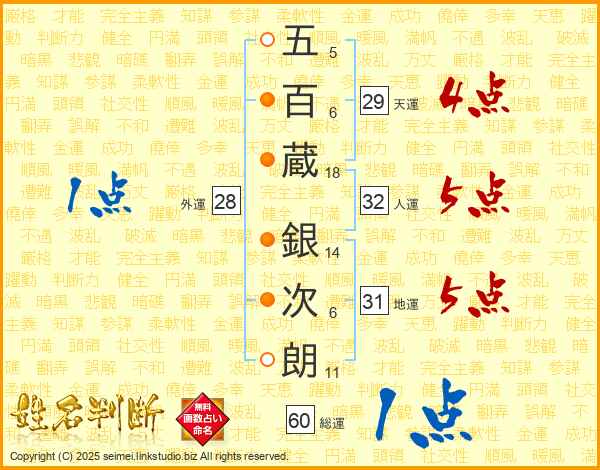 五(5画)百(6画)蔵(18画) 銀(14画)次(6画)朗(11画)