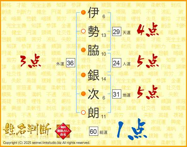 伊(6画)勢(13画)脇(10画) 銀(14画)次(6画)朗(11画)