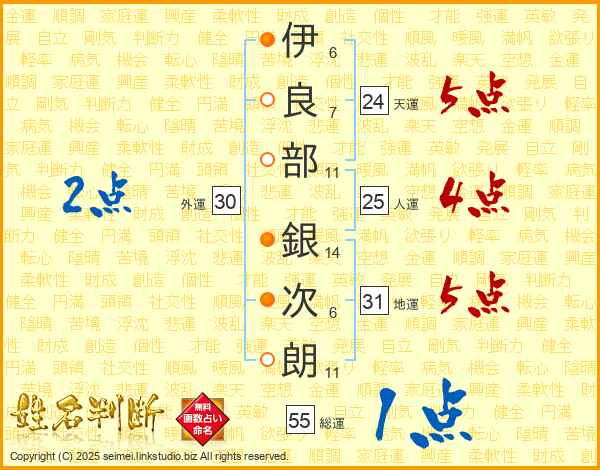 伊(6画)良(7画)部(11画) 銀(14画)次(6画)朗(11画)