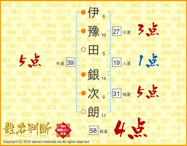 伊(6画)豫(16画)田(5画) 銀(14画)次(6画)朗(11画)