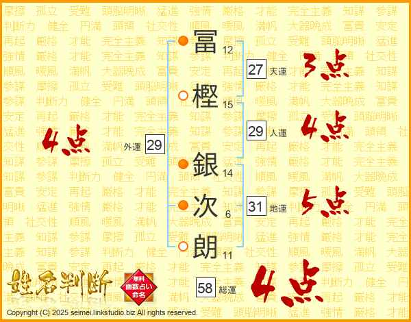 冨(12画)樫(15画) 銀(14画)次(6画)朗(11画)
