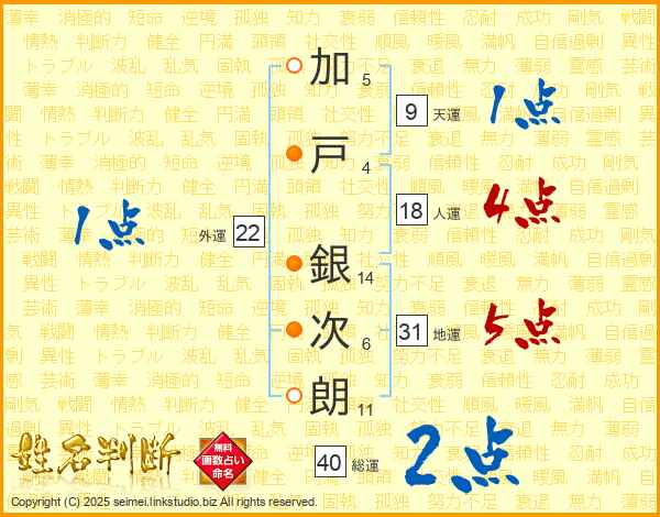 加(5画)戸(4画) 銀(14画)次(6画)朗(11画)
