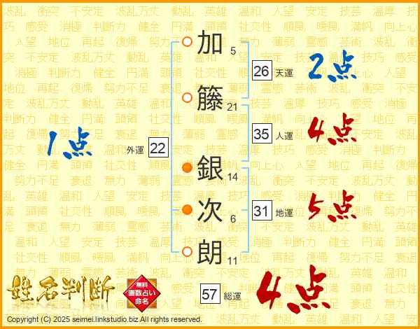 加(5画)籐(21画) 銀(14画)次(6画)朗(11画)
