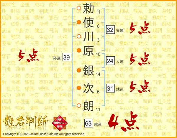 勅(11画)使(8画)川(3画)原(10画) 銀(14画)次(6画)朗(11画)