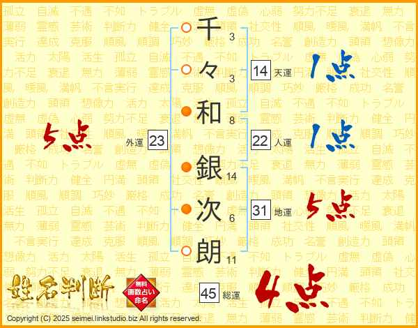 千(3画)々(3画)和(8画) 銀(14画)次(6画)朗(11画)