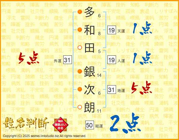 多(6画)和(8画)田(5画) 銀(14画)次(6画)朗(11画)