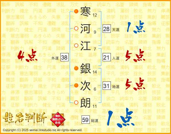 寒(12画)河(9画)江(7画) 銀(14画)次(6画)朗(11画)