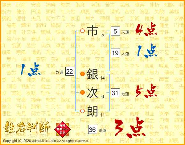 生活面を象徴する運勢です。外部から受ける影響力を表し、結婚運、家庭運や職場、環境への順応性を表します。総運から人運を引いた画数。姓や名が1文字の場合を除く。