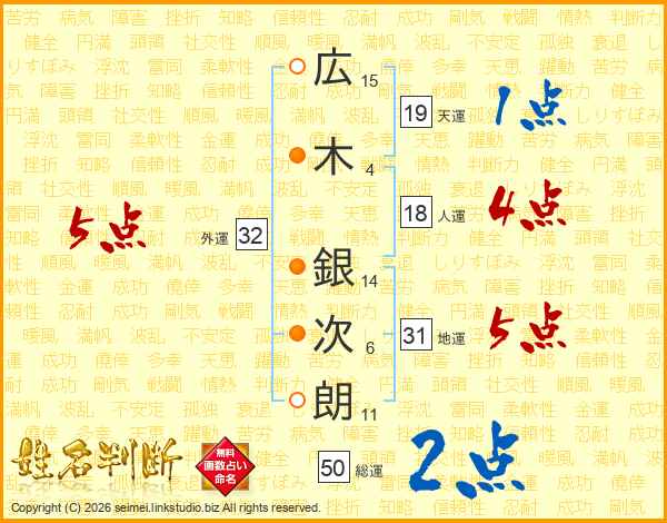 広(15画)木(4画) 銀(14画)次(6画)朗(11画)