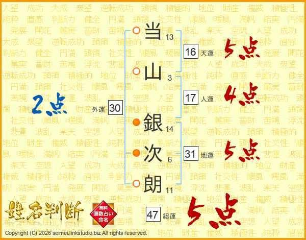 当(13画)山(3画) 銀(14画)次(6画)朗(11画)